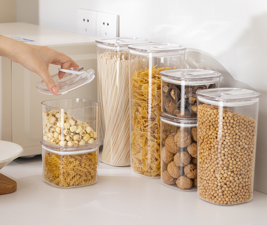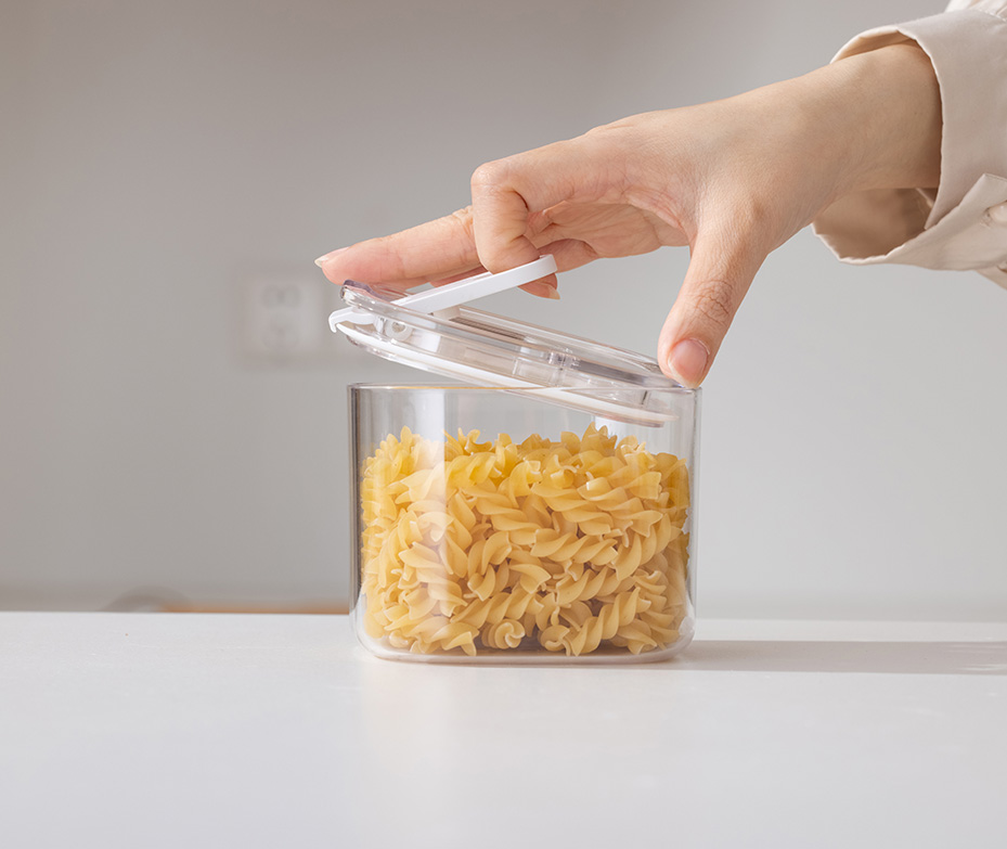 • Single-handed operation - Lift to open . • food-grade AS material • Glass-like clarity for easy visibility of contents. • Manicure-friendly design • Refined silhouette, effortless to hold. • Airtight and waterproof with a silicone freshess seal. • Available in 4 sizes to meet all your pantry storage needs.