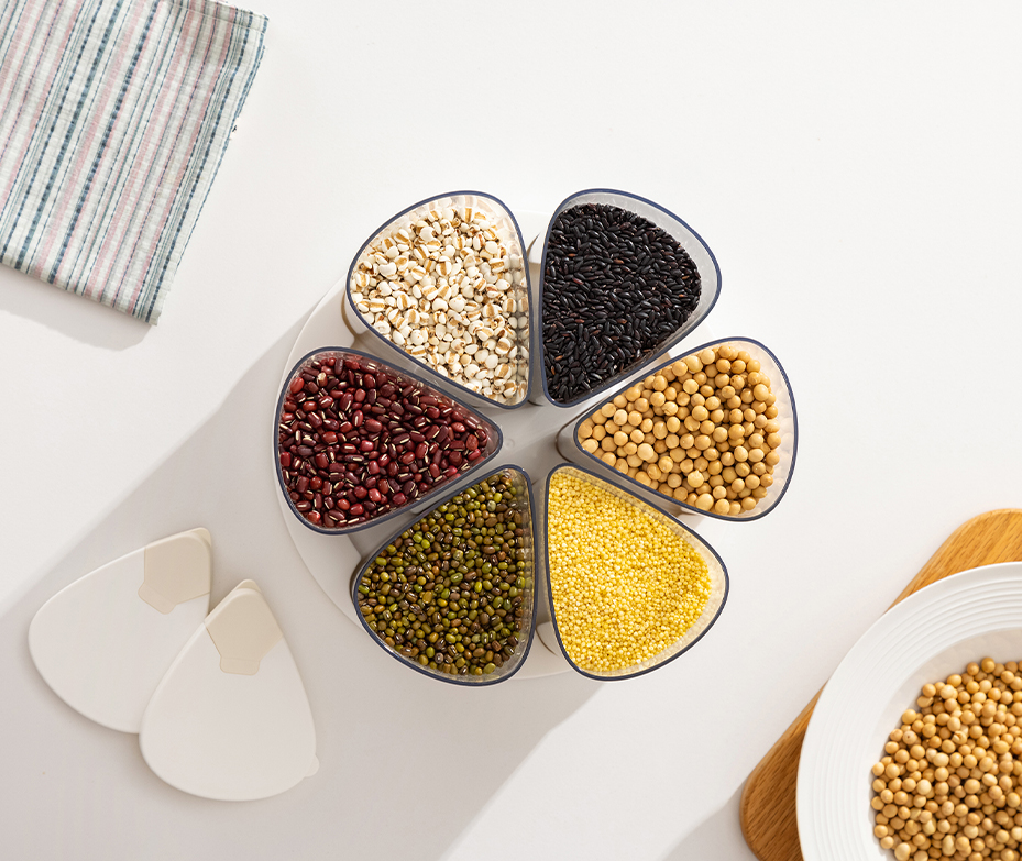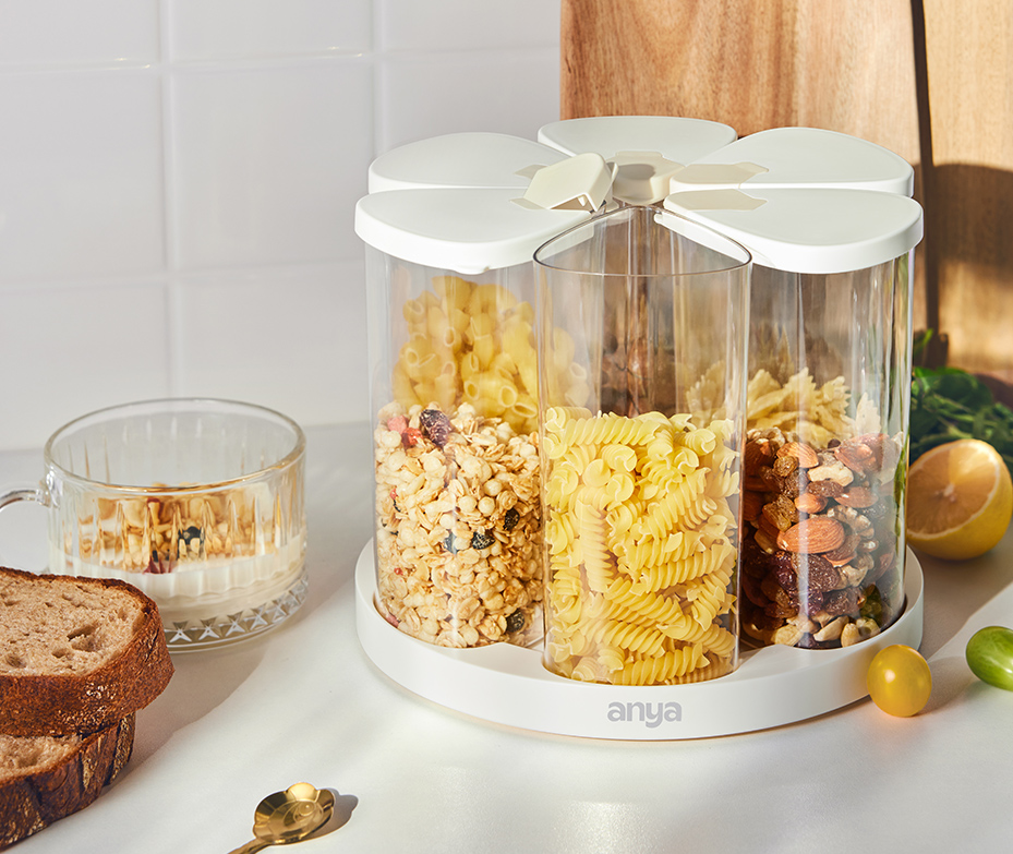 ·360° rotation for easy access ·Six removable seperated jars for tidy storage ·Two opening modes. No-spill with small spout and big opening for refilling ·650ml per jar, ideal for daily needs