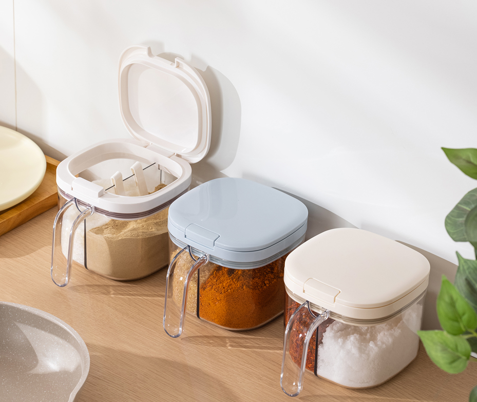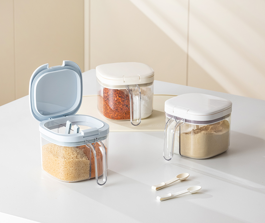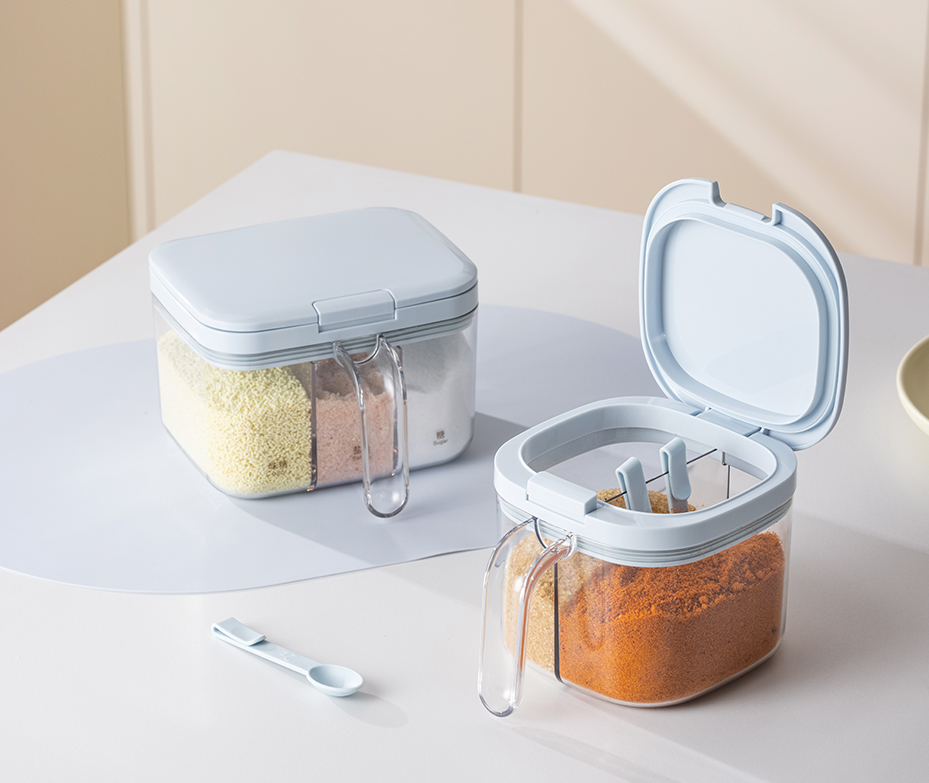 •One jug with two grids. Easy to take seasonings. •470ml each grid for one bag of salt. •One click opening. •Food grade silicone gasket. Damp proof and anti-blocking. •2ml spoon with scratch design for healthy use. •Easy cleaning with detachable lid •Eco-friendly and food grade PET material. Transparent with good looking.