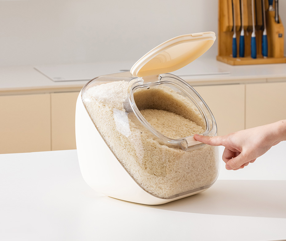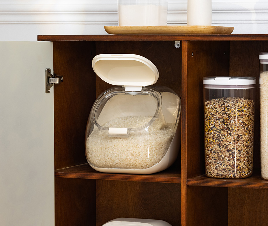 • A single touch, instant access. • Multi-angle adjustment fits different cabinet heights. • Mess-free meal prep • Space-efficient cabinet design. • Airtight with a silicone freshess seal. • Perfect for pantry and pet food storage.