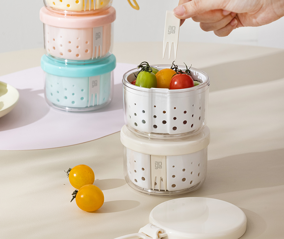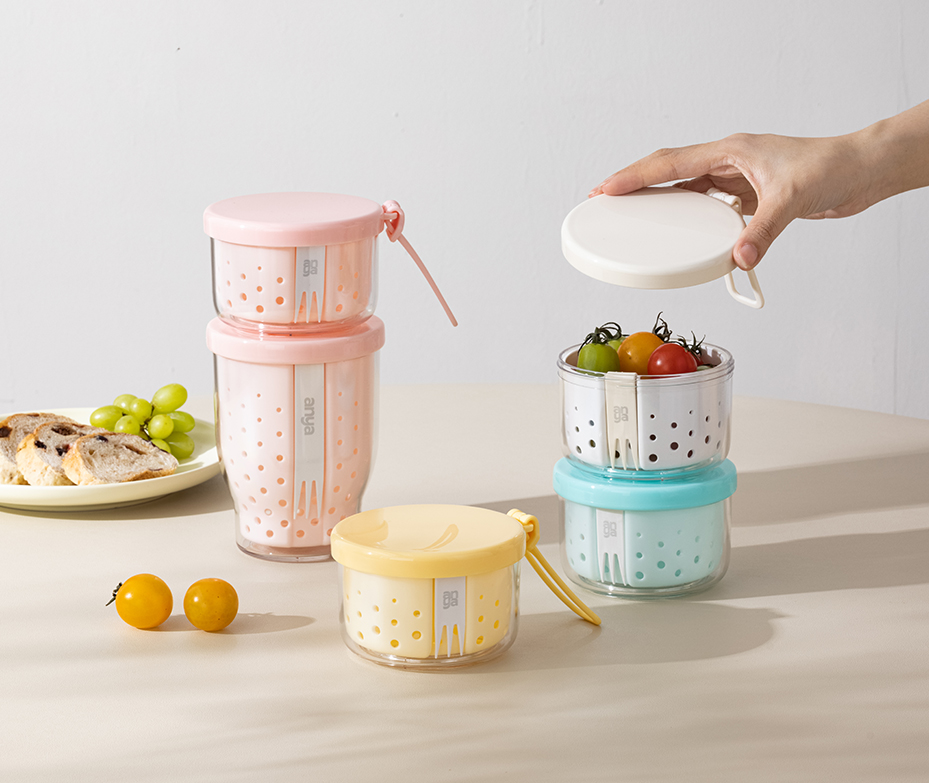 •More convenient for takeout with stacked structure and seperate storage. •Delicate capacity of 400ml for travel light. •Leakproof silicone gasket for safe outdoor use. •Easy washing and free of soaking with built-in drainer. •Convenient to carry with silicone belt •Food grade AS material. Eco-friendly and oderless. Good looking with high transparent body