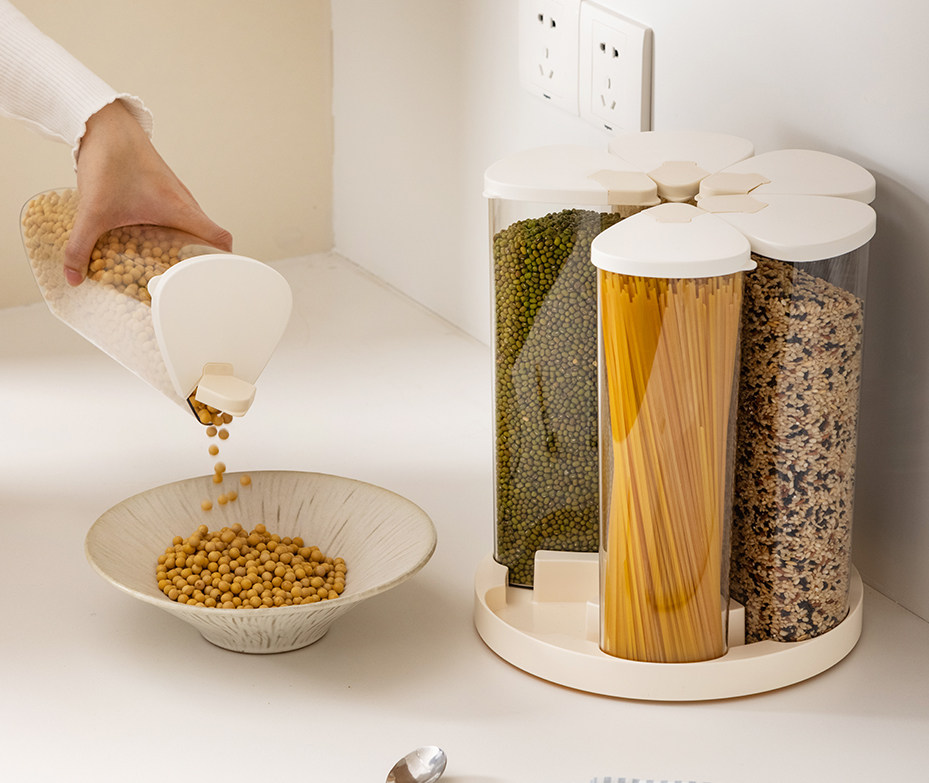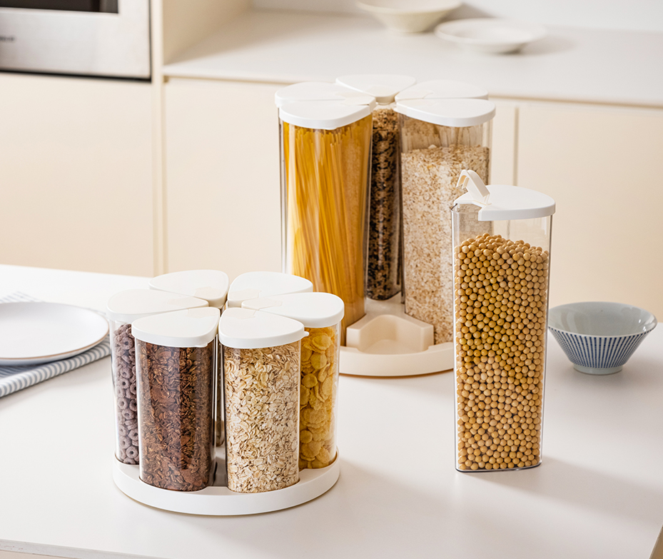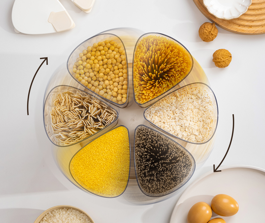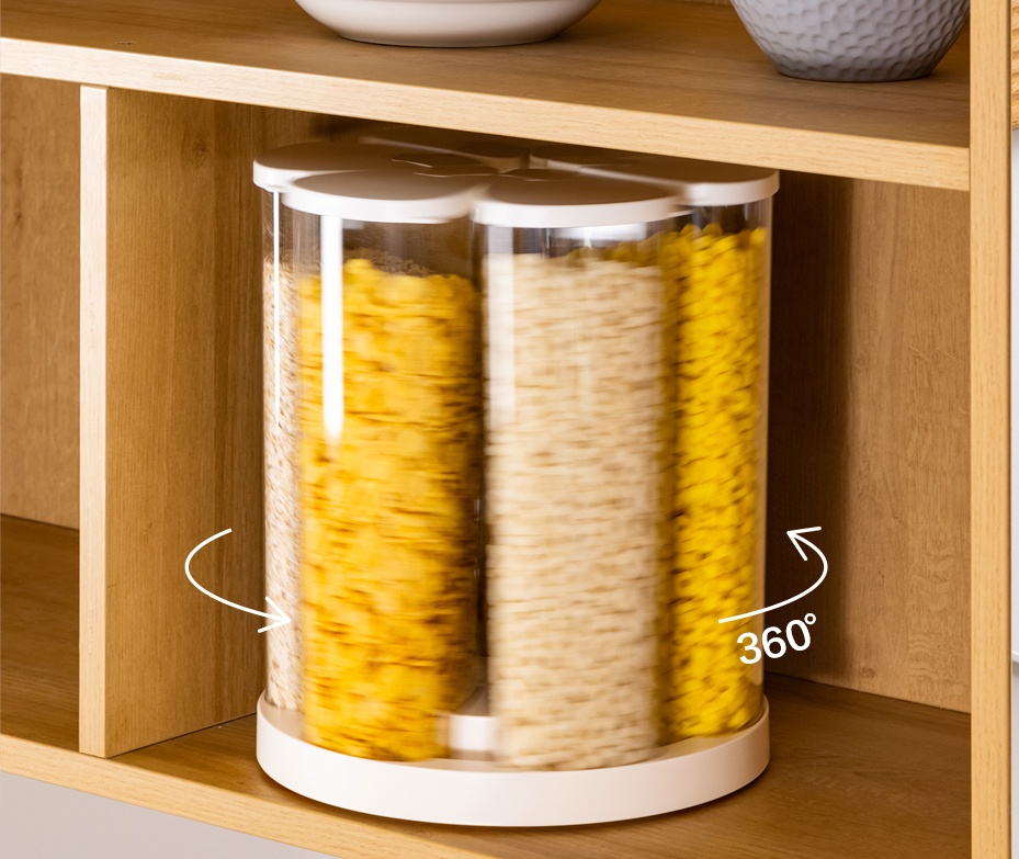 ·The upgraded capacity version of 1400mL. ·360° rotation for easy access ·Six removable seperated jars for tidy storage ·Various types of noodles can be easily stored and organized ·Two opening modes. No-spill with small spout and big opening for refilling ·650ml per jar, ideal for daily needs